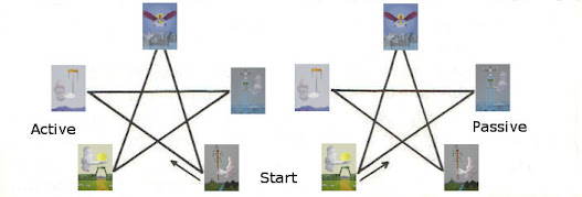 Because Nathan was creating a living image based on the Eight of Cups with the Tarot Pentagram Spread, he placed all the foundation cards down on his makeshift altar with the tops facing west on his altar. Since Water is a passive element, Nathan used the Passive Invoking Pentagram while laying down the cards, starting in the lower left corner of the pentagram, moving to the upper right corner and continuing from there. After he placed all of the cards, he tapped each card in the direction of the Passive Invoking Pentagram, making sure to tap the one in the lower left corner to complete the pentagram.